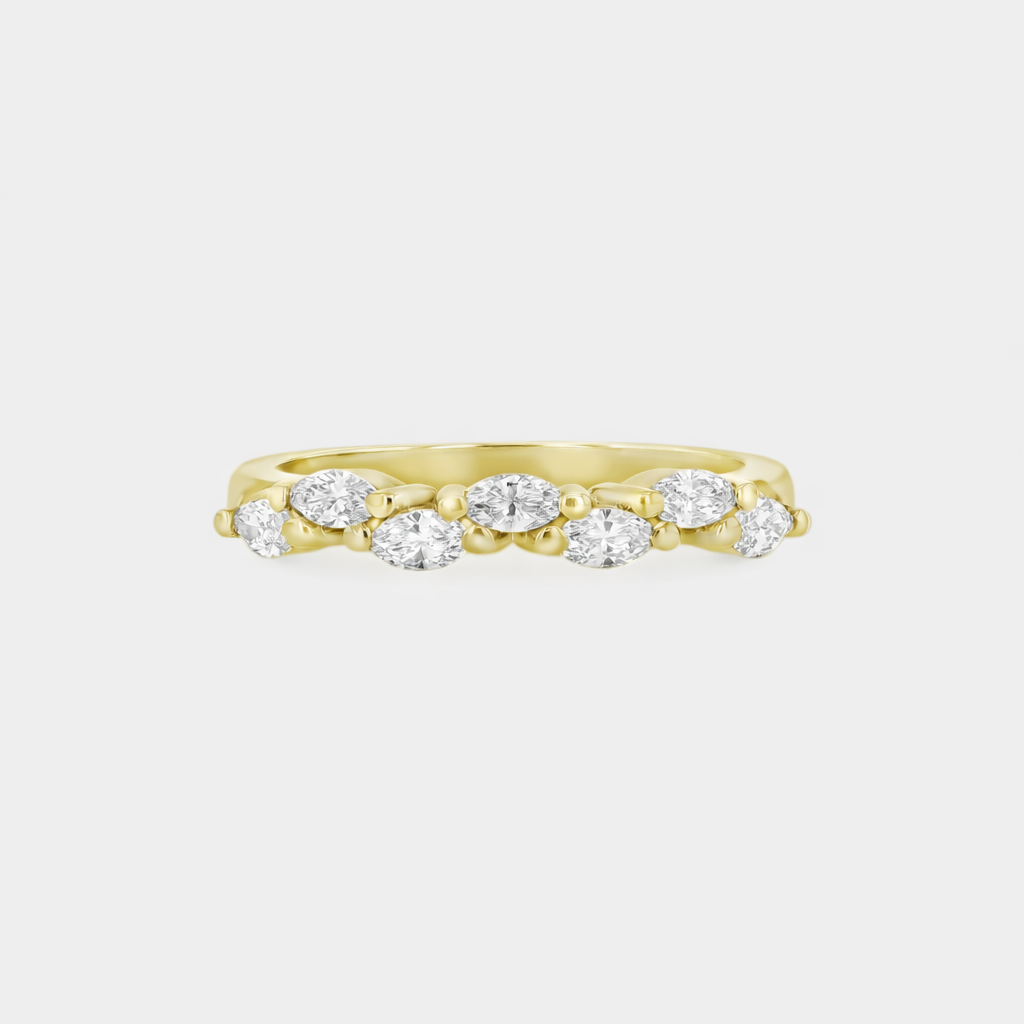 This graceful diamond band is perfect to stand alone, be stacked with itself or in a wedding set. With seven beautiful marquise cut stones arranged in a snaking formation the Paloma creates a beautiful lattice of diamonds when stacked.