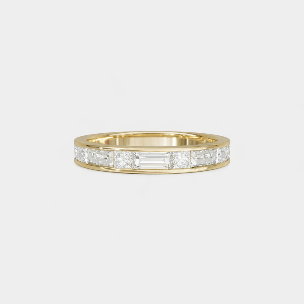 This delicate diamond band features an elegant sequence of baguette and princess-cut diamonds, thoughtfully set to create a subtle, architectural shimmer. Refined in scale yet rich in detail, it’s designed to stack effortlessly or shine on its own. A bold version is also available: Jamie Luxe Diamond Band