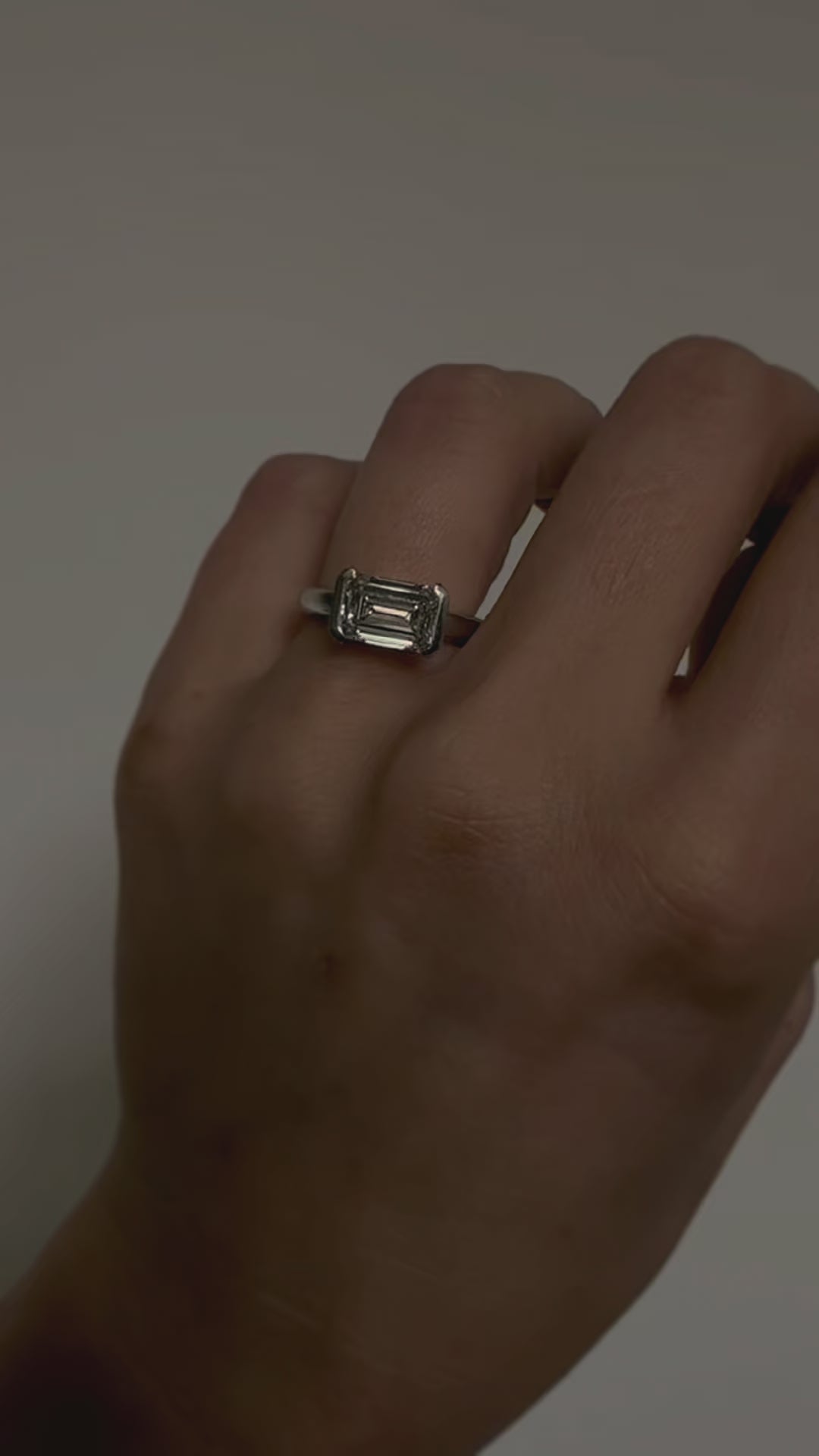 Vivian East-West Radiant Ring features a half bezel setting with a radiant or emerald-cut diamond and a thick band. Designed for the modern woman. Pairs well with the Penelope Luxe Diamond Band.