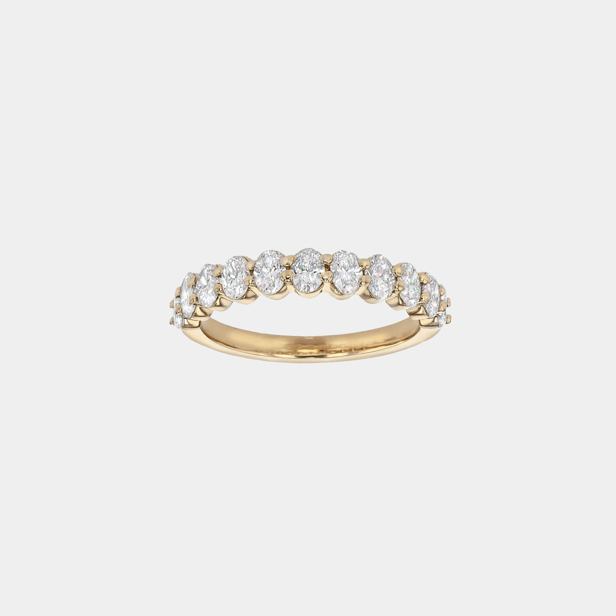 The Eleanor Luxe Diamond Band features an elegant row of oval diamonds, held in refined claw settings that highlight their elegant shape and brilliant sparkle. The elongated stones create a graceful flow around the finger, making it a perfect choice to celebrate a special moment with timeless beauty and modern refinement.