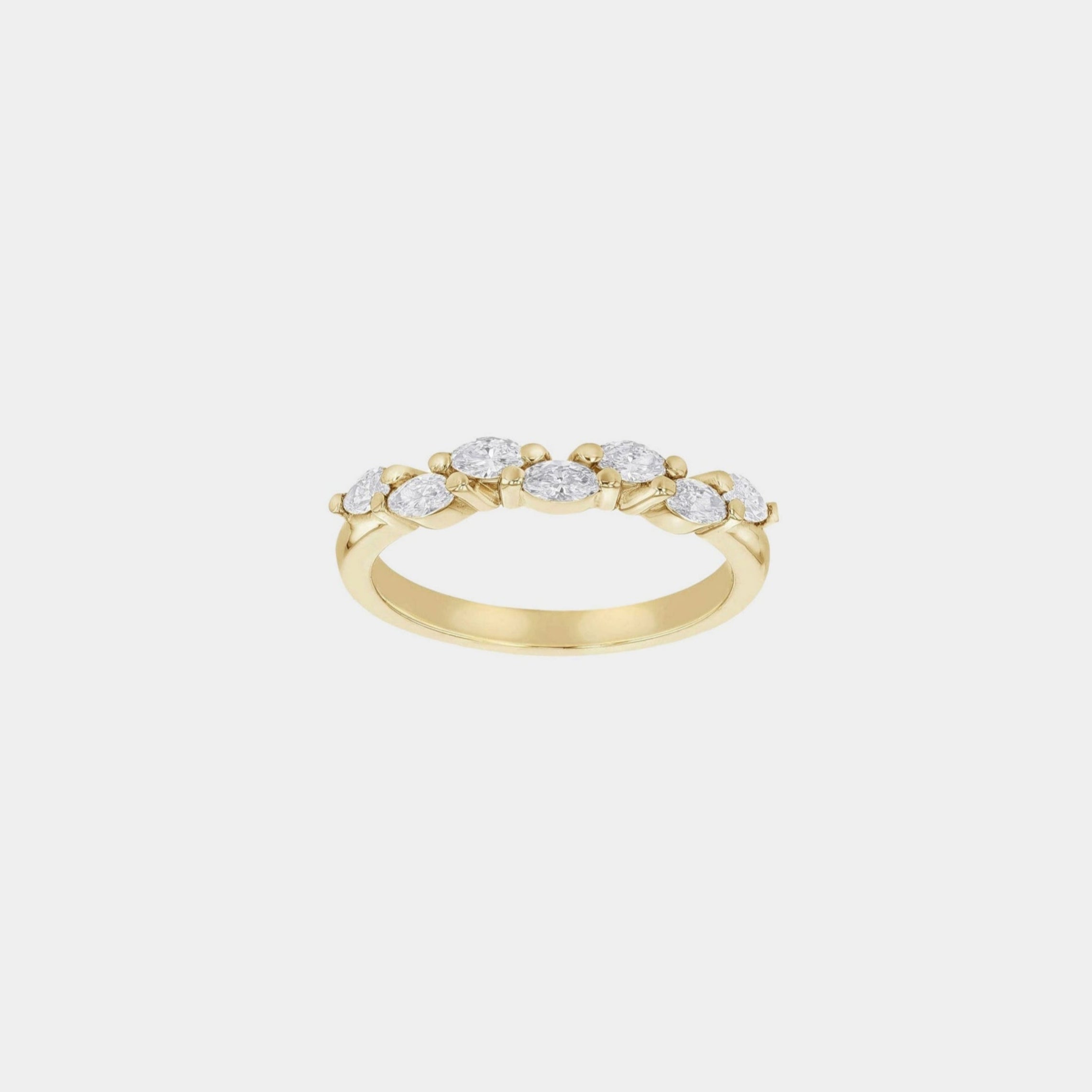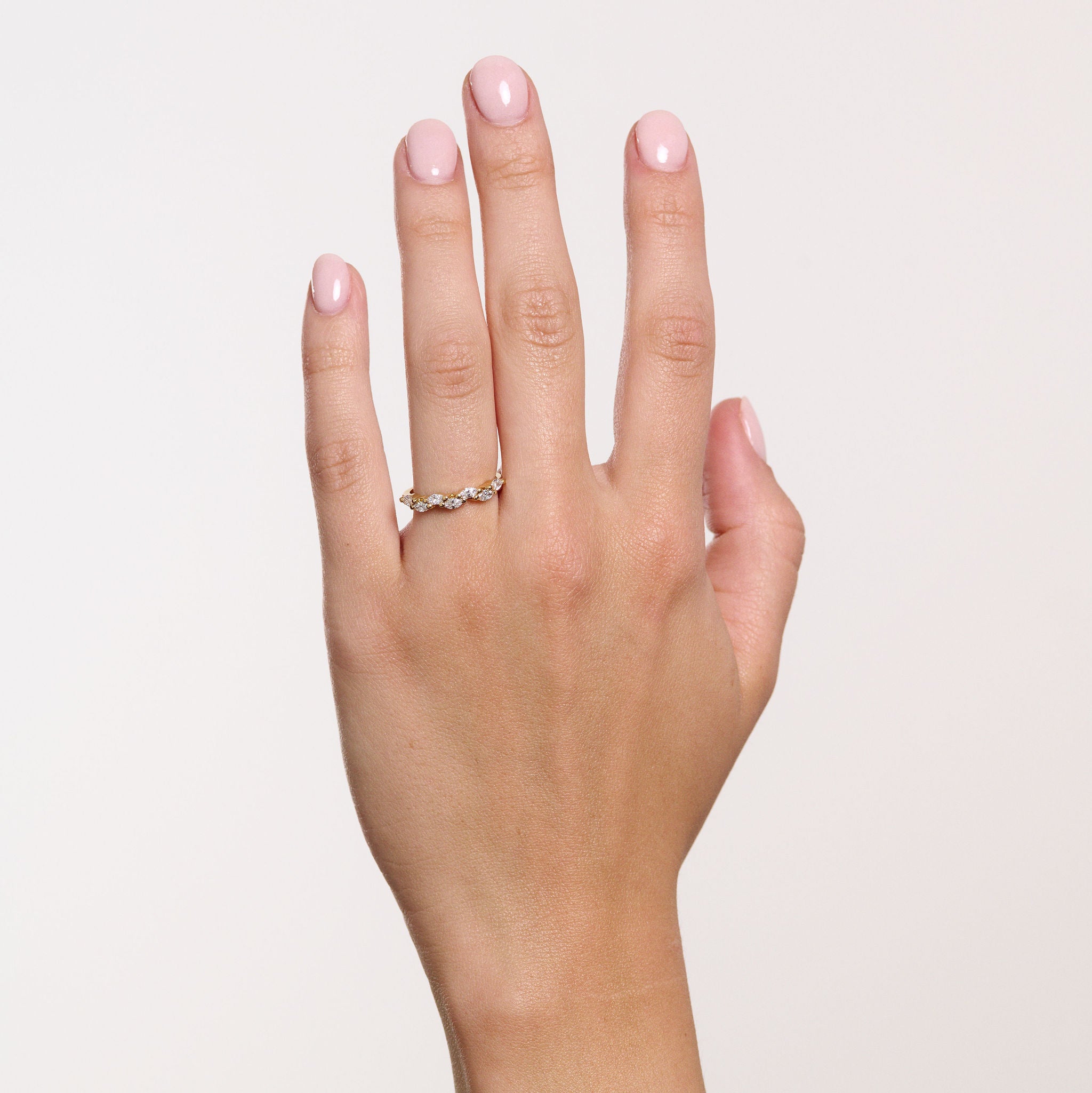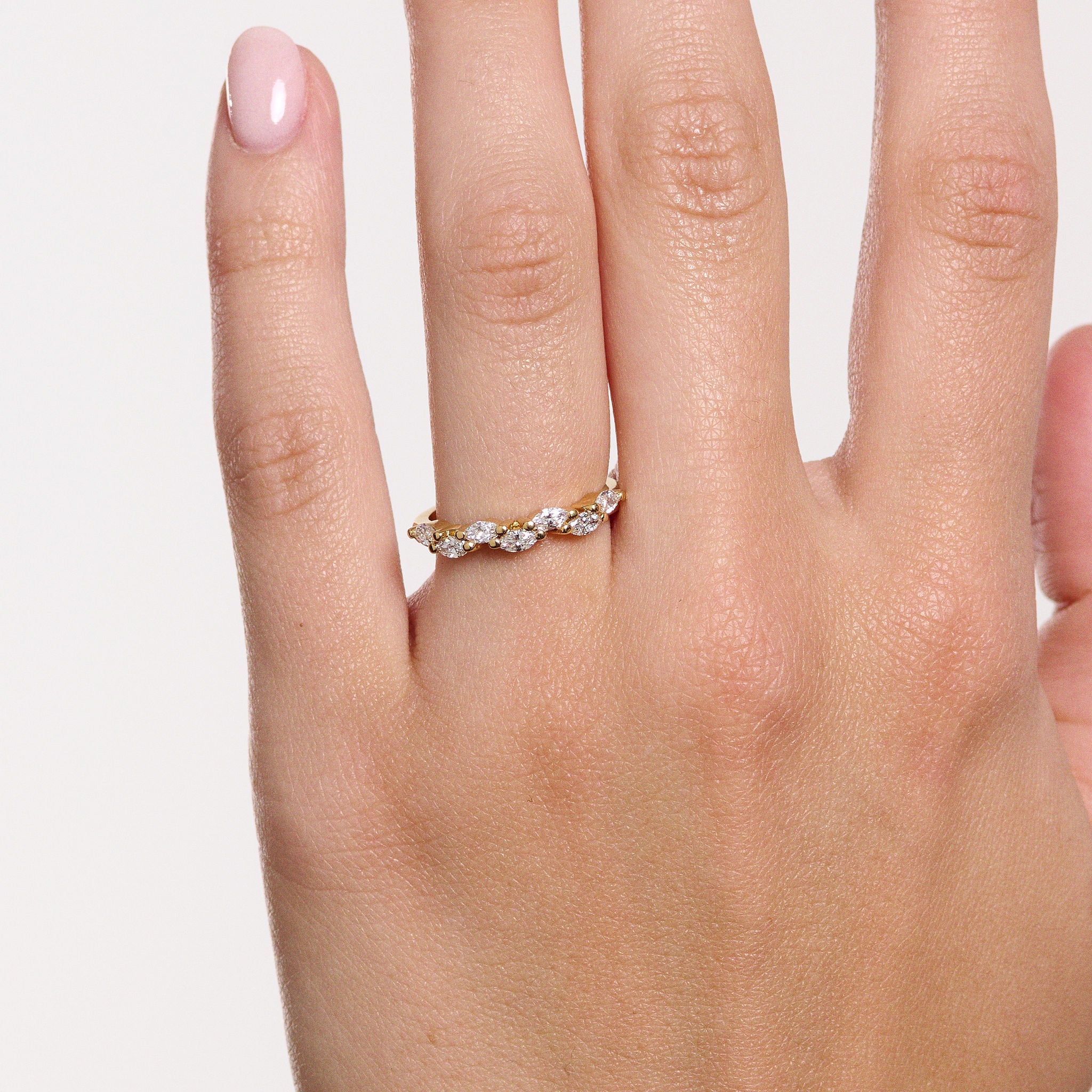 This graceful diamond band is perfect to stand alone, be stacked with itself or in a wedding set. With seven beautiful marquise cut stones arranged in a snaking formation the Paloma creates a beautiful lattice of diamonds when stacked.