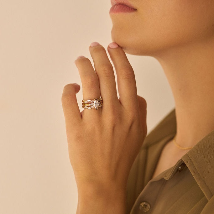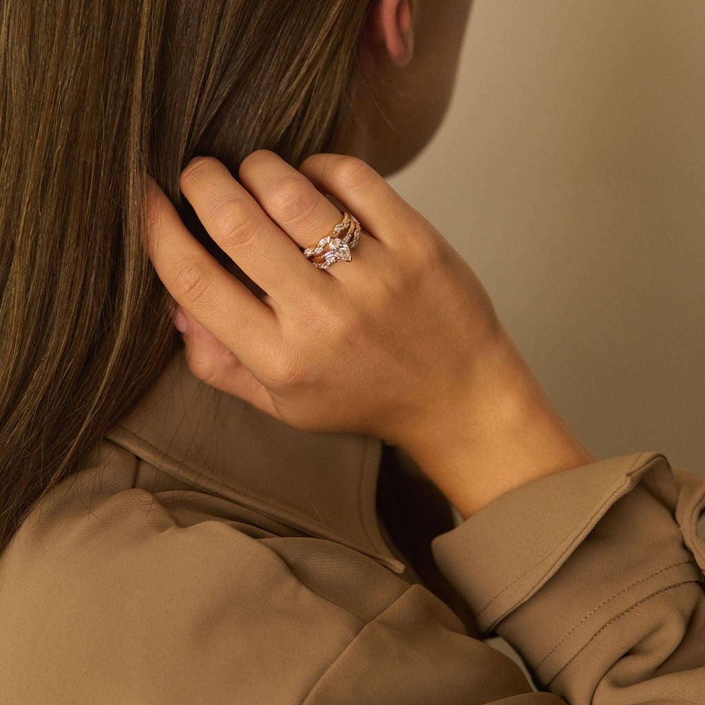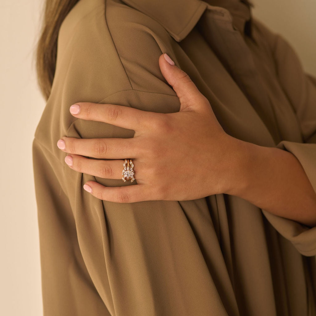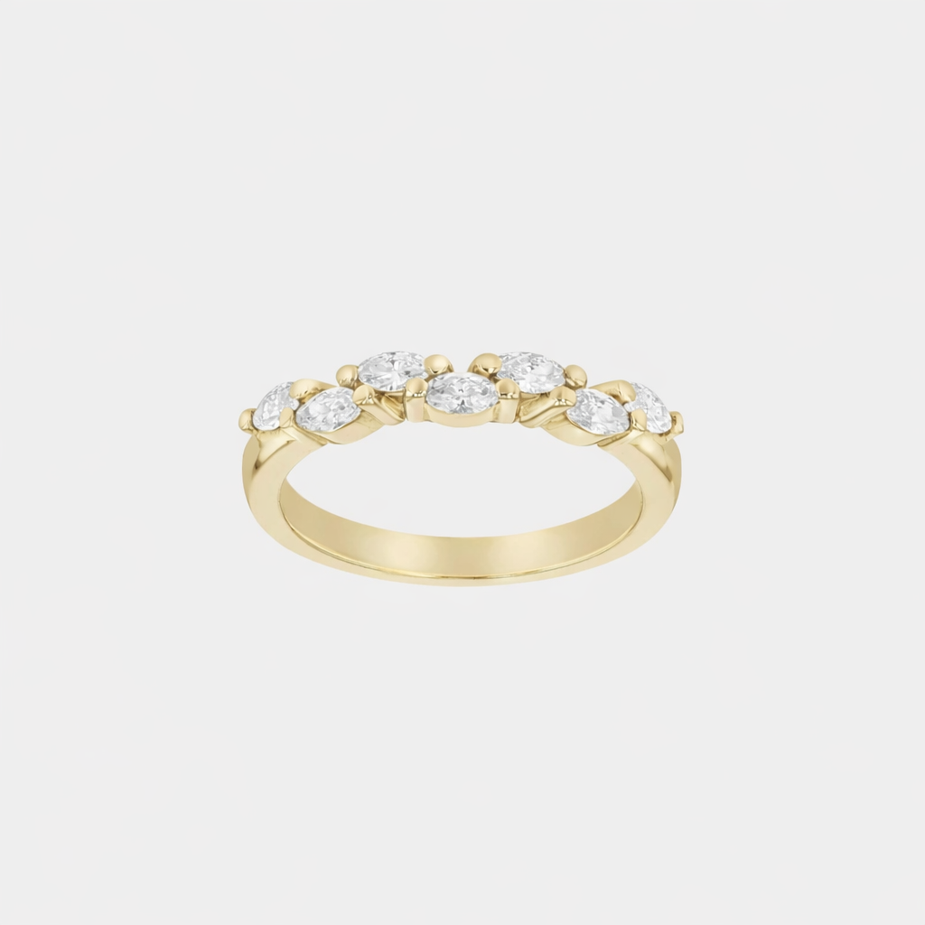 This graceful diamond band is perfect to stand alone, be stacked with itself or in a wedding set. With seven beautiful marquise cut stones arranged in a snaking formation the Paloma creates a beautiful lattice of diamonds when stacked.