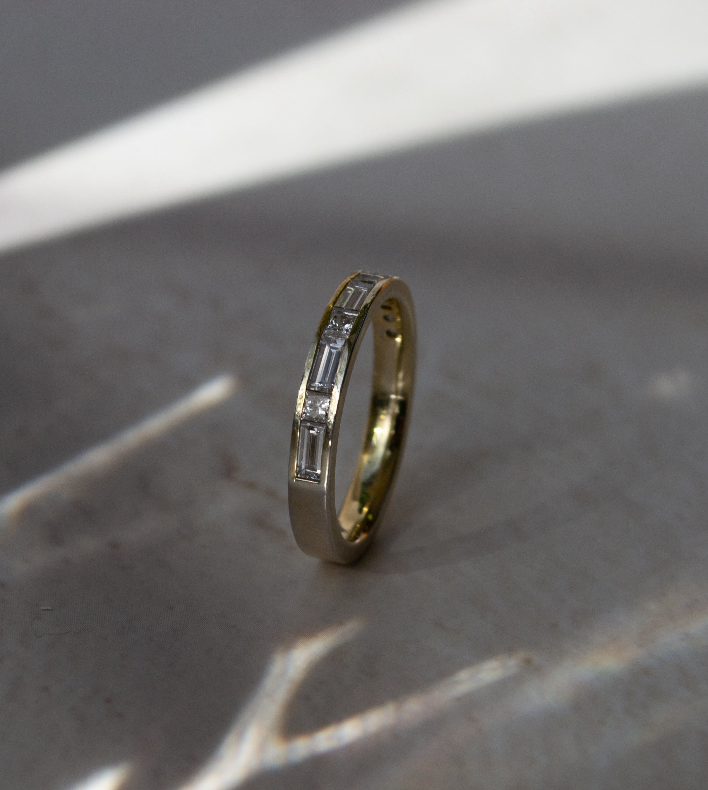 This delicate diamond band features an elegant sequence of baguette and princess-cut diamonds, thoughtfully set to create a subtle, architectural shimmer. Refined in scale yet rich in detail, it’s designed to stack effortlessly or shine on its own. A bold version is also available: Jamie Luxe Diamond Band