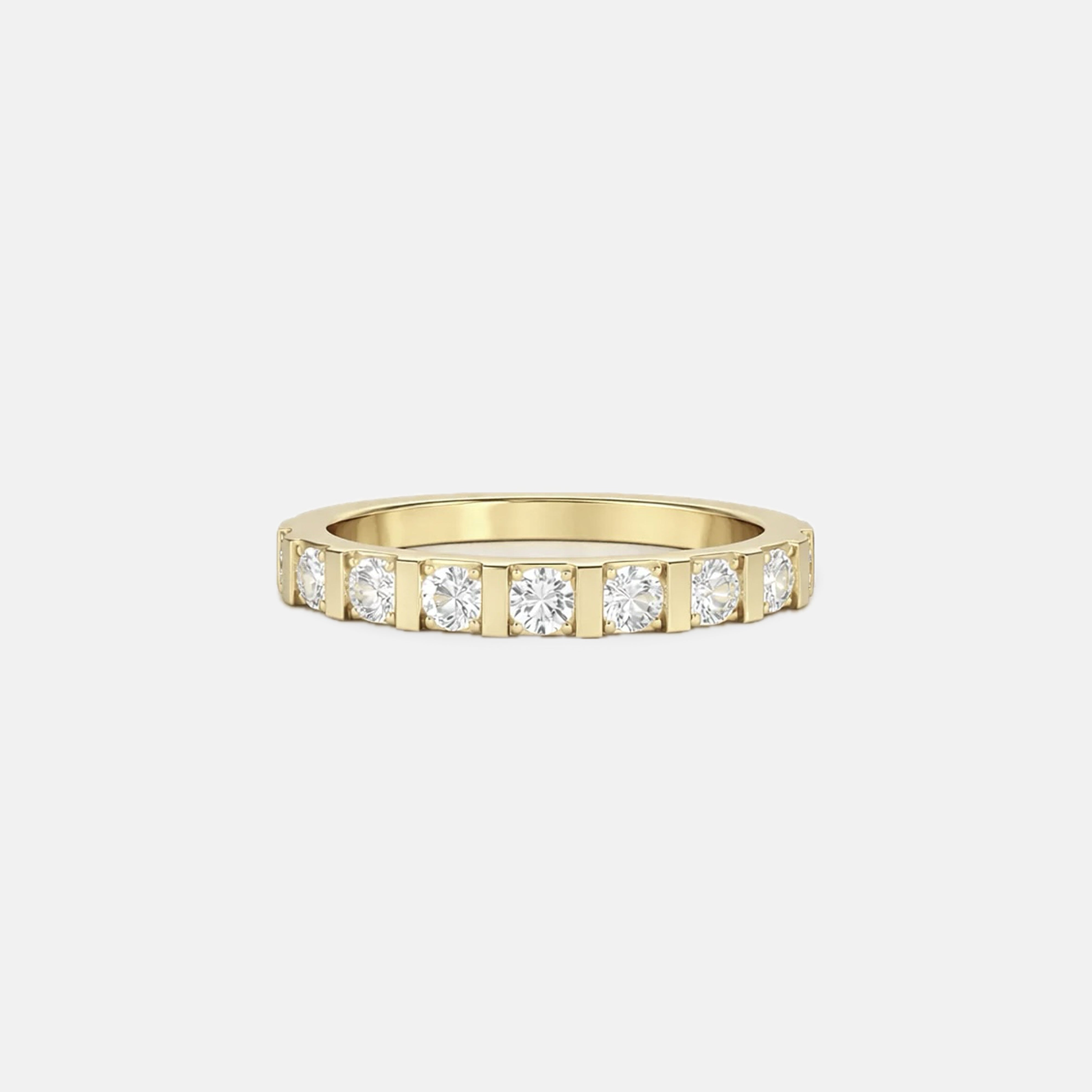 This modern band showcases round brilliant diamonds, bar set individually along half the band. The spaced design offers a modern rhythm, allowing each diamond to catch the light while maintaining unique silhouette. Perfect to wear alone or layered.