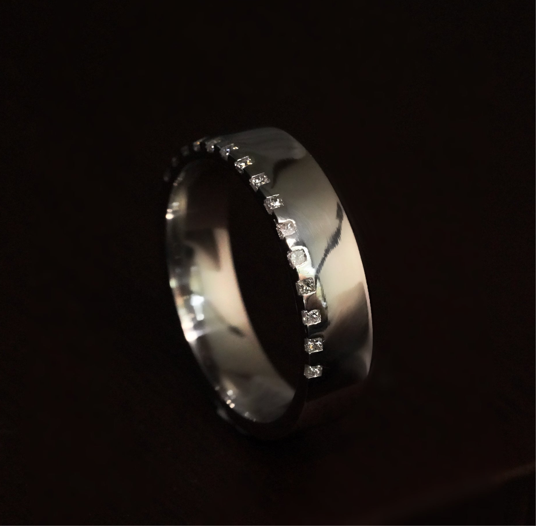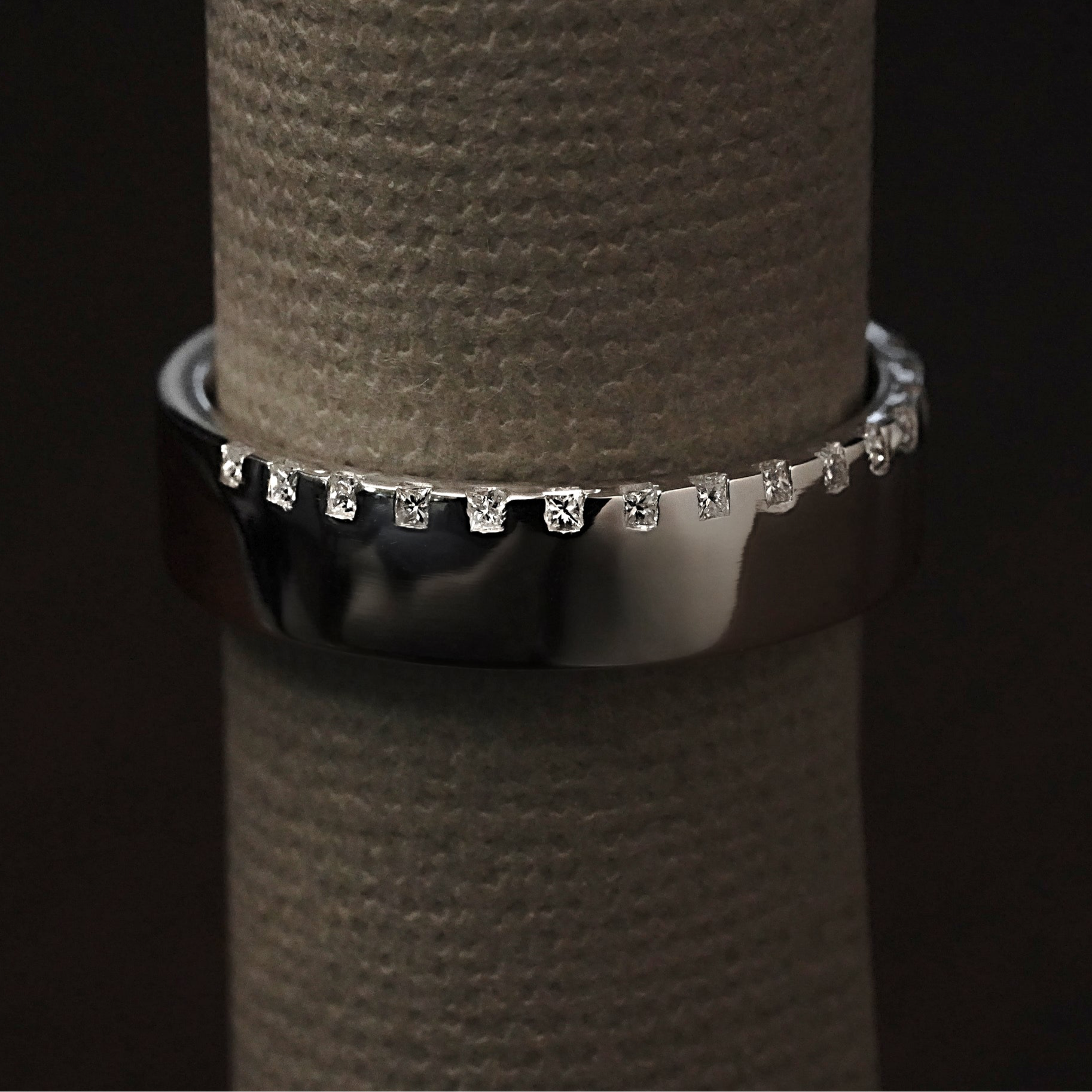 The Taylor Luxe features generously sized princess-cut diamonds, each precisely spaced along half of the band for a refined yet contemporary feel. The balance of bold diamonds and open space creates a striking silhouette—perfect for making a subtle statement with modern edge.