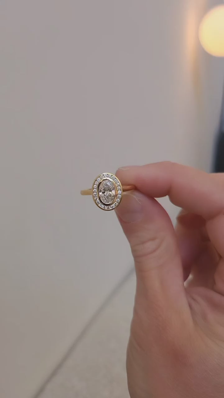 The Georgia engagement ring showcases a stunning oval diamond in a sleek bezel setting, surrounded by a halo of channel set diamonds. Crafted with a comfort fit band, this design combines clean lines with understated brilliance. Its timeless elegance makes it a sophisticated choice for those seeking a modern yet classic look.