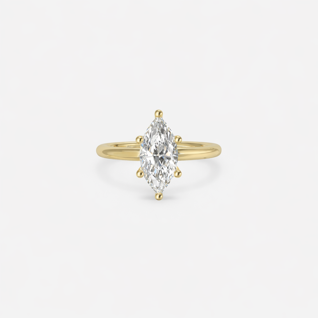 This six-prong marquise solitaire engagement ring is a masterpiece of timeless elegance, featuring a dazzling marquise-cut diamond that elongates the finger and radiates unmatched brilliance. The six-prong setting of the Mia ensures both security and a graceful silhouette, while the sleek band enhances its classic sophistication.